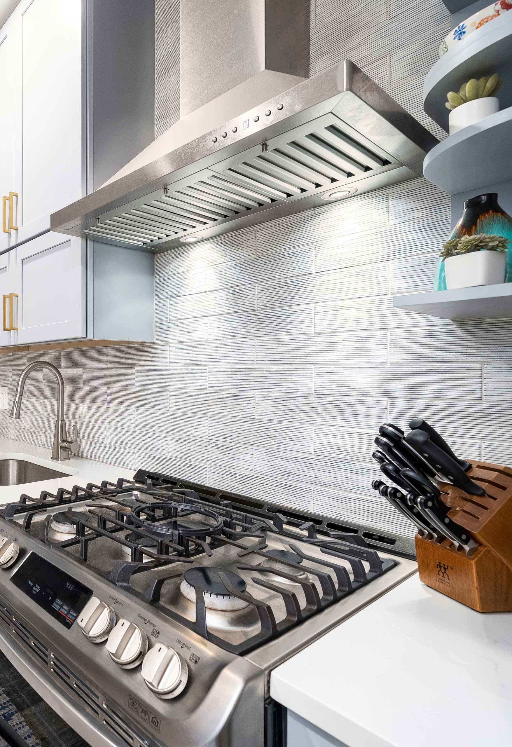 exudes a refreshing and contemporary atmosphere with its thoughtfully chosen design elements. The focal point of the space is the grey cabinets to create a harmonious color palette that is both soothing and sophisticated. These cabinets not only contribute to the aesthetic appeal but also provide ample storage for kitchen essentials.