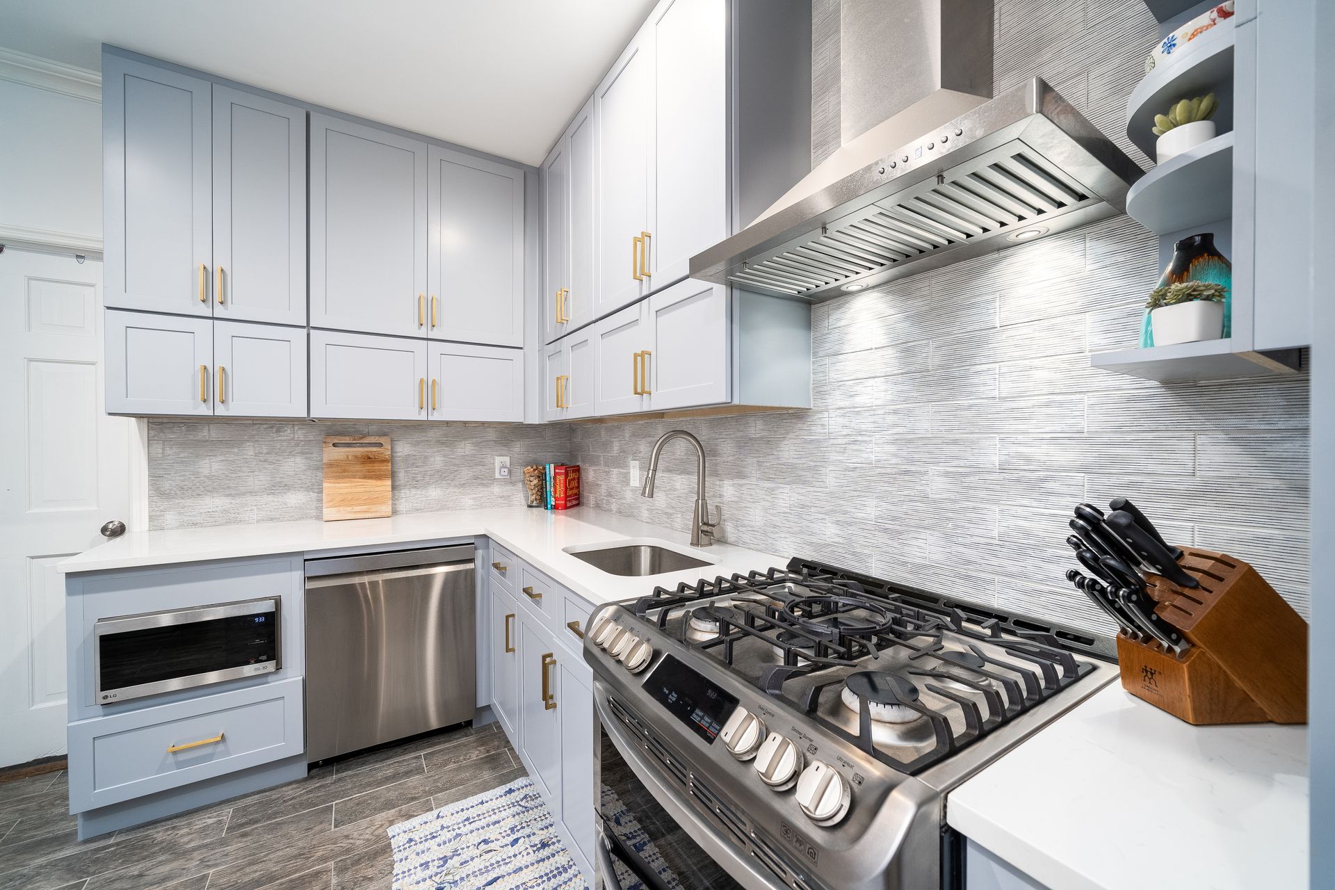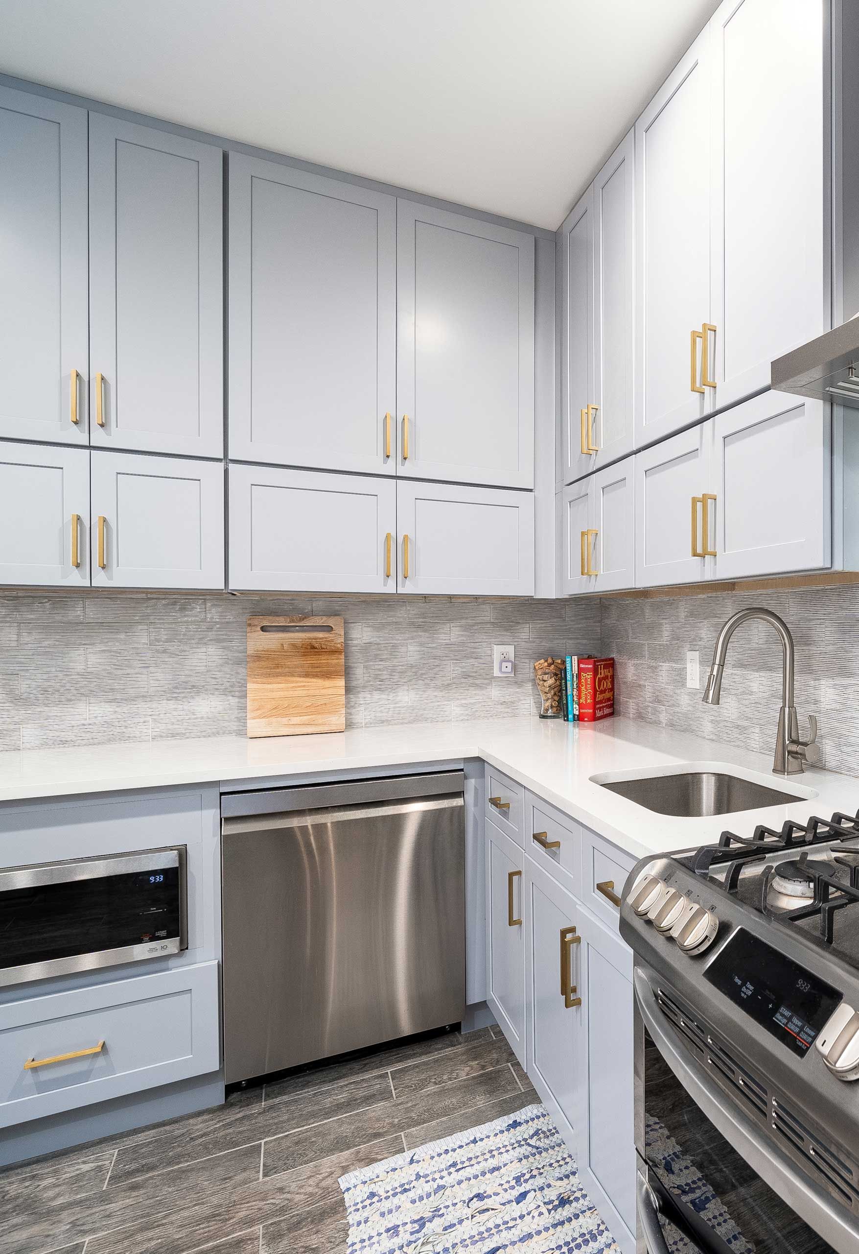 Complementing the cabinets are the richly textured wood floors, adding warmth and depth to the overall ambiance. The juxtaposition of these earthy tones against the coolness of the grey hues creates a visually dynamic and inviting environment, just as the client ordered! Requested, was a combination of California coastal meets Hoboken waterfront, with comfortable and contemporary elements.