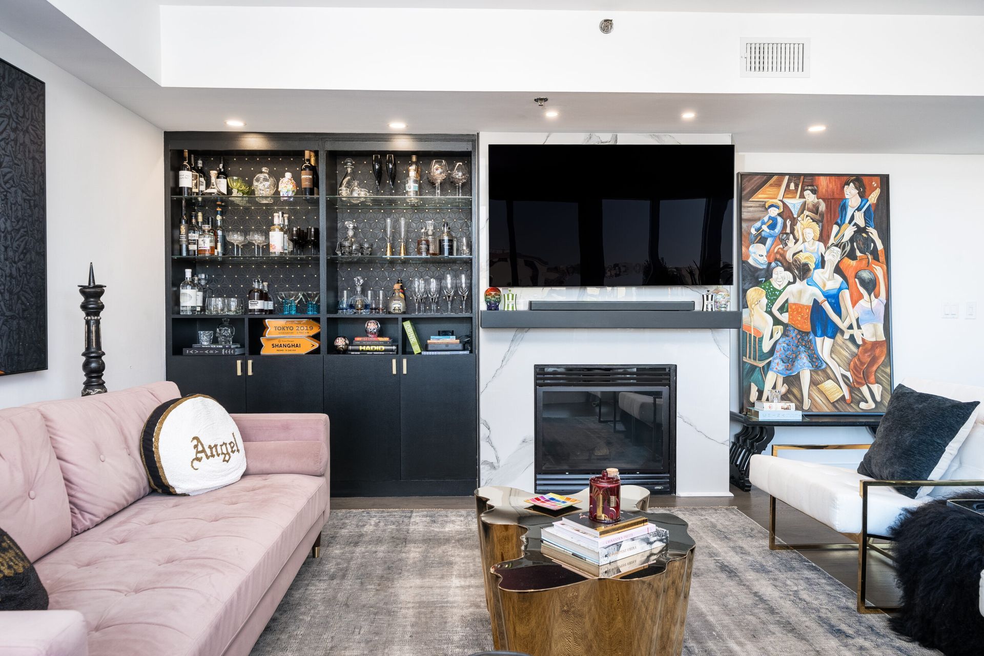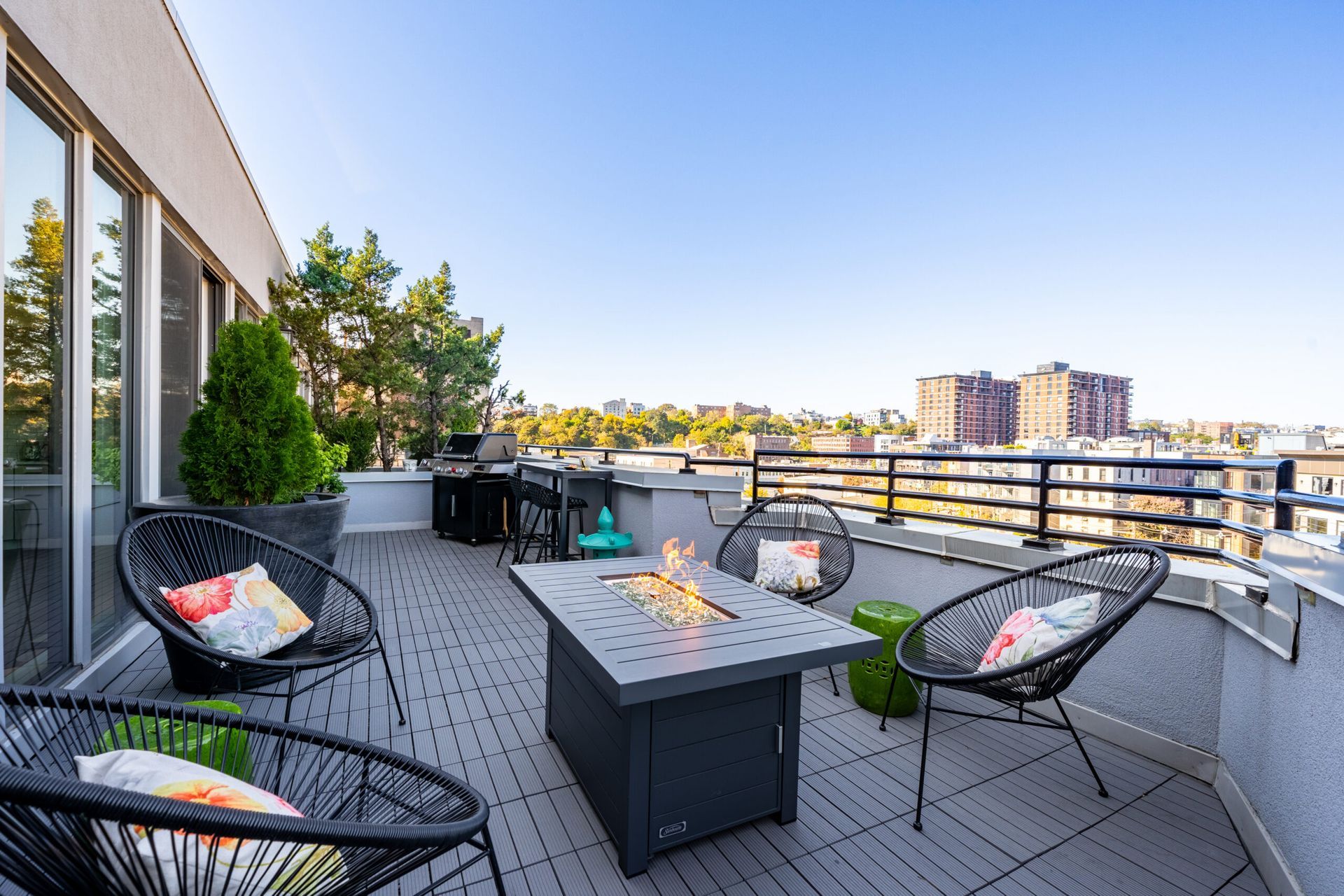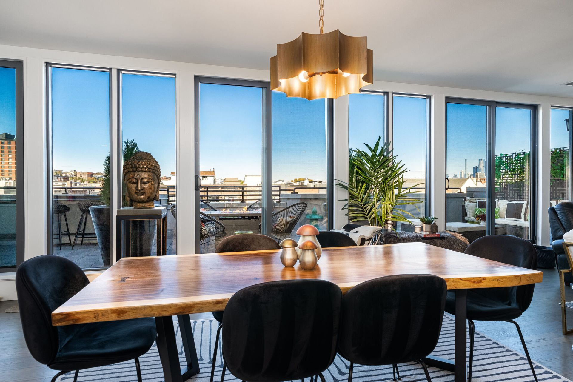Every detail of this terrace oasis is meticulously curated to harmonize with the cosmopolitan ambiance. Stylish and comfortable furnishings beckon you to unwind and savor the moment, whether it’s lounging with a cocktail in hand or hosting an intimate gathering with friends against the panoramic backdrop of Manhattan’s architectural marvels. The custom porcelain clad fireplace and matte black bar, combined with the gold leaf fixtures, create a sitting and dining area to be jealous of.