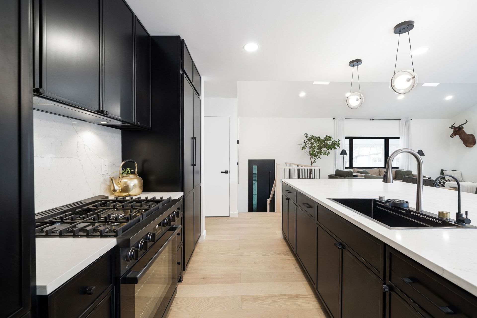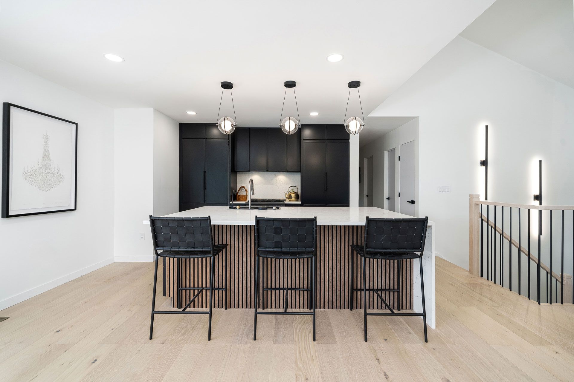 The fourth bedroom was sacrificed to make way for an expansive, chef-inspired kitchen, complete with a hidden pantry and sleek, solid black modern shaker cabinetry. Walnut accent paneling on the kitchen island adds warmth, while hidden appliances maintain a clean, minimalist aesthetic.