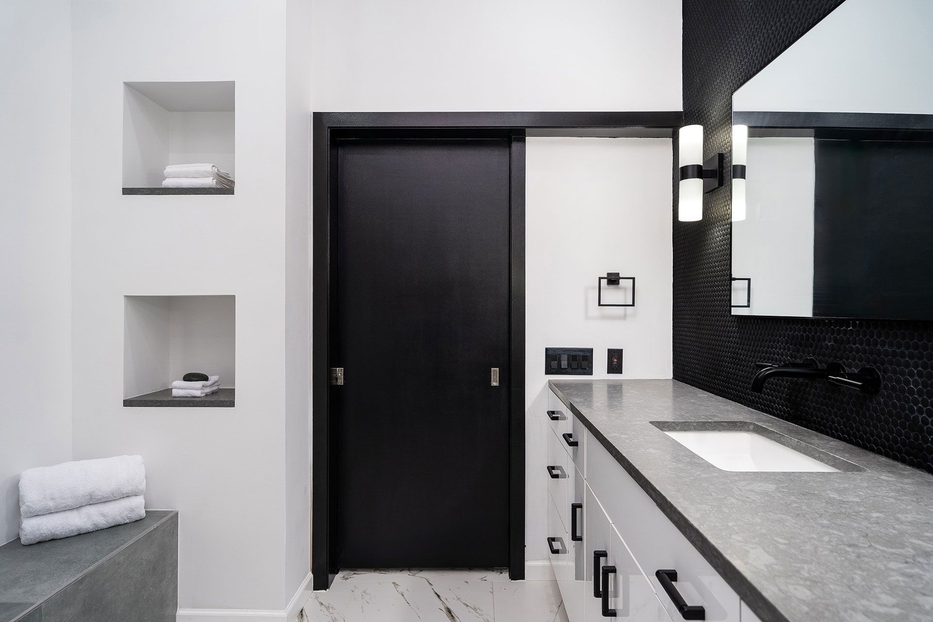 Matte black fixtures and hardware are used consistently across the space, adding definition and visual contrast. These elements help tie together the palette while reinforcing the modern, streamlined aesthetic.