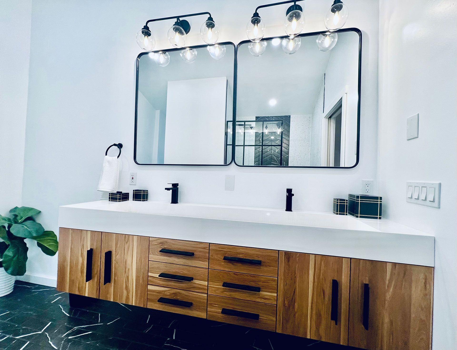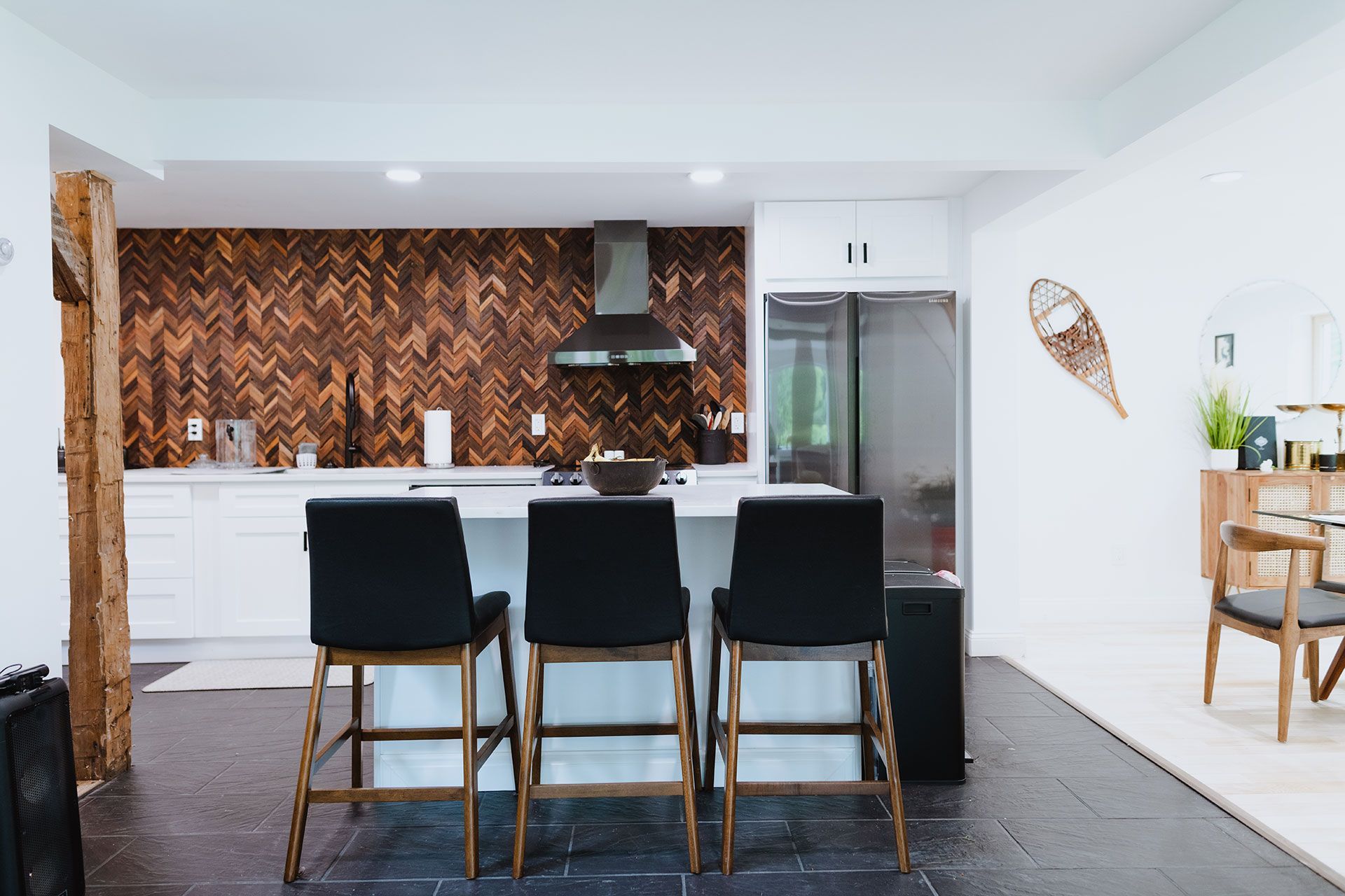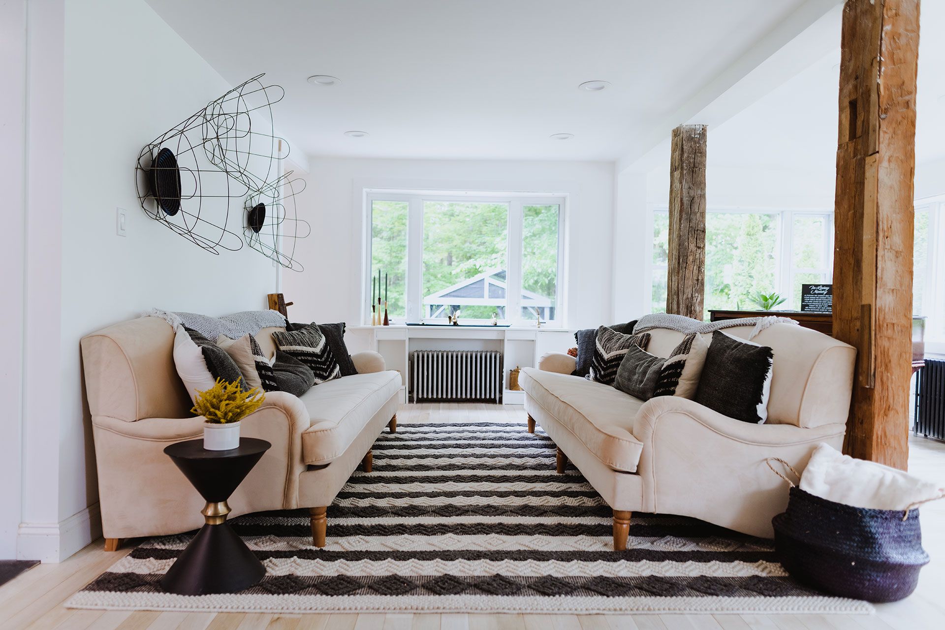 Embarking on a full gut renovation, the Manor underwent a radical metamorphosis, embracing a bold mid-century modern aesthetic that seamlessly blended the timeless allure of natural wood finishes with striking black and white accents. The result was nothing short of a breathtaking showpiece that retained the farmhouse’s historic charm while ushering in a new era of sophistication and functionality.