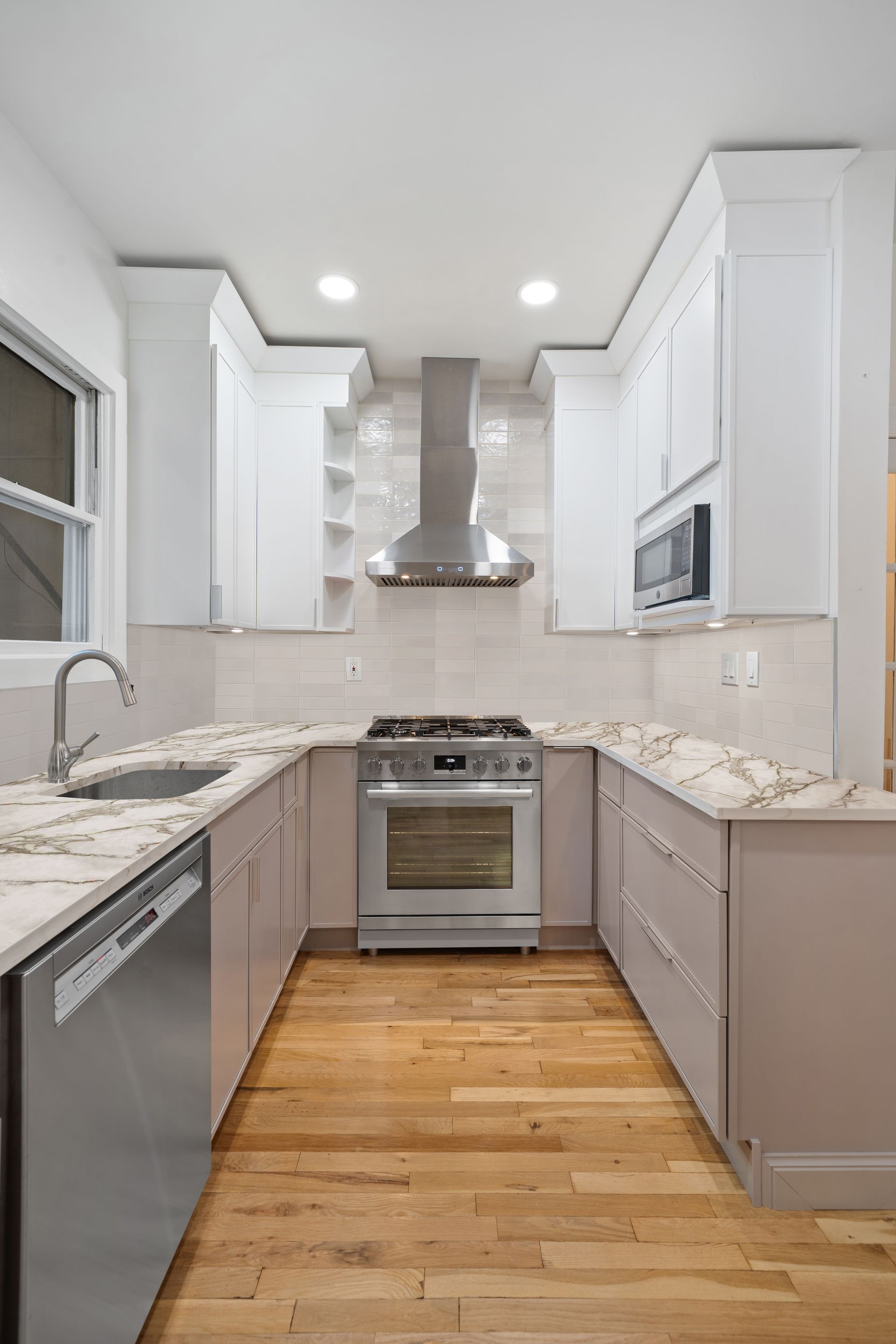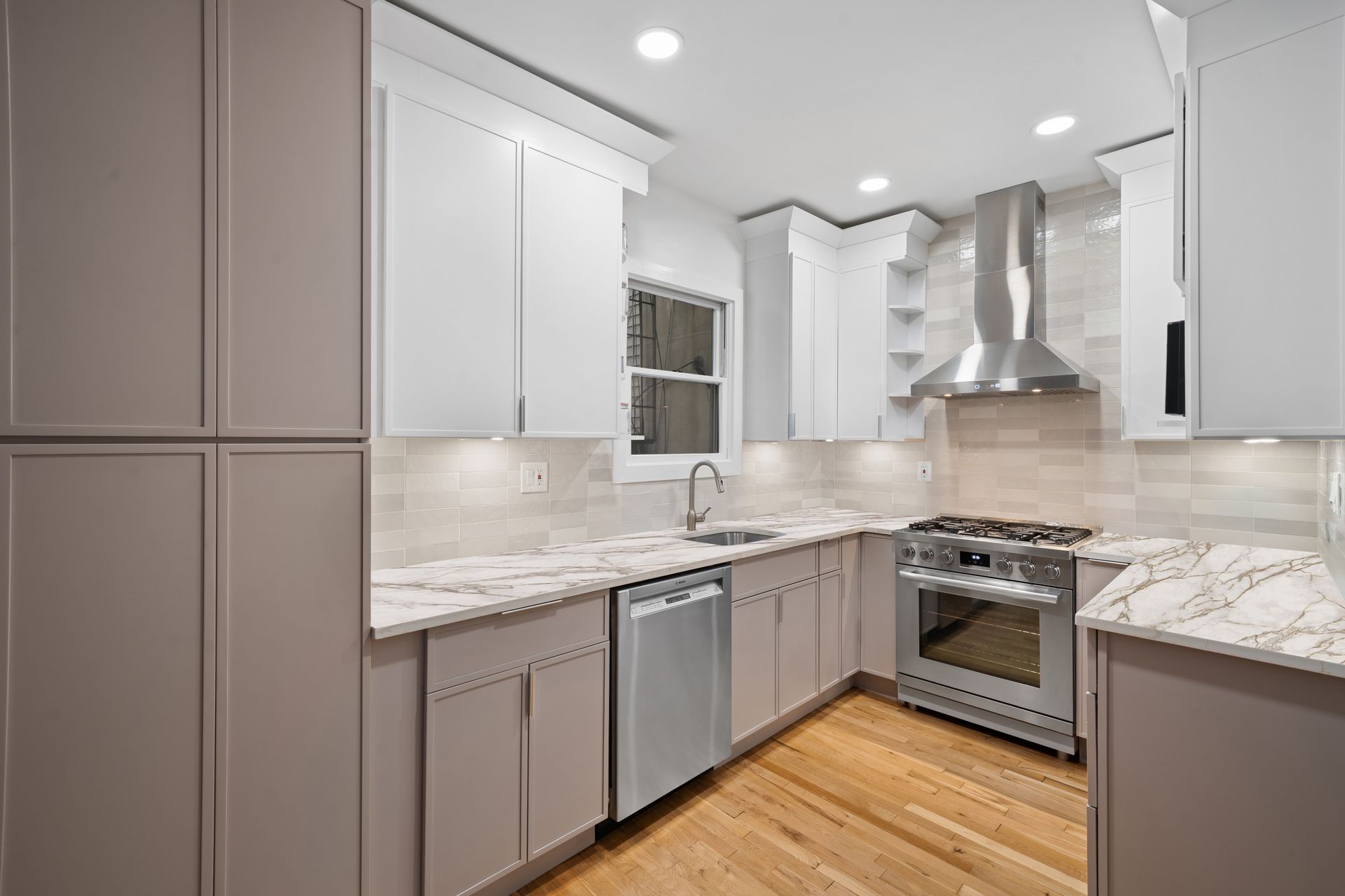 A defining architectural detail is the custom double-step crown molding, designed to extend the cabinetry while creating a recessed reveal for integrated uplighting. This feature enhances ceiling height perception and introduces ambient lighting, adding both function and atmosphere to the space—particularly important in a row house kitchen renovation where natural light can be limited.