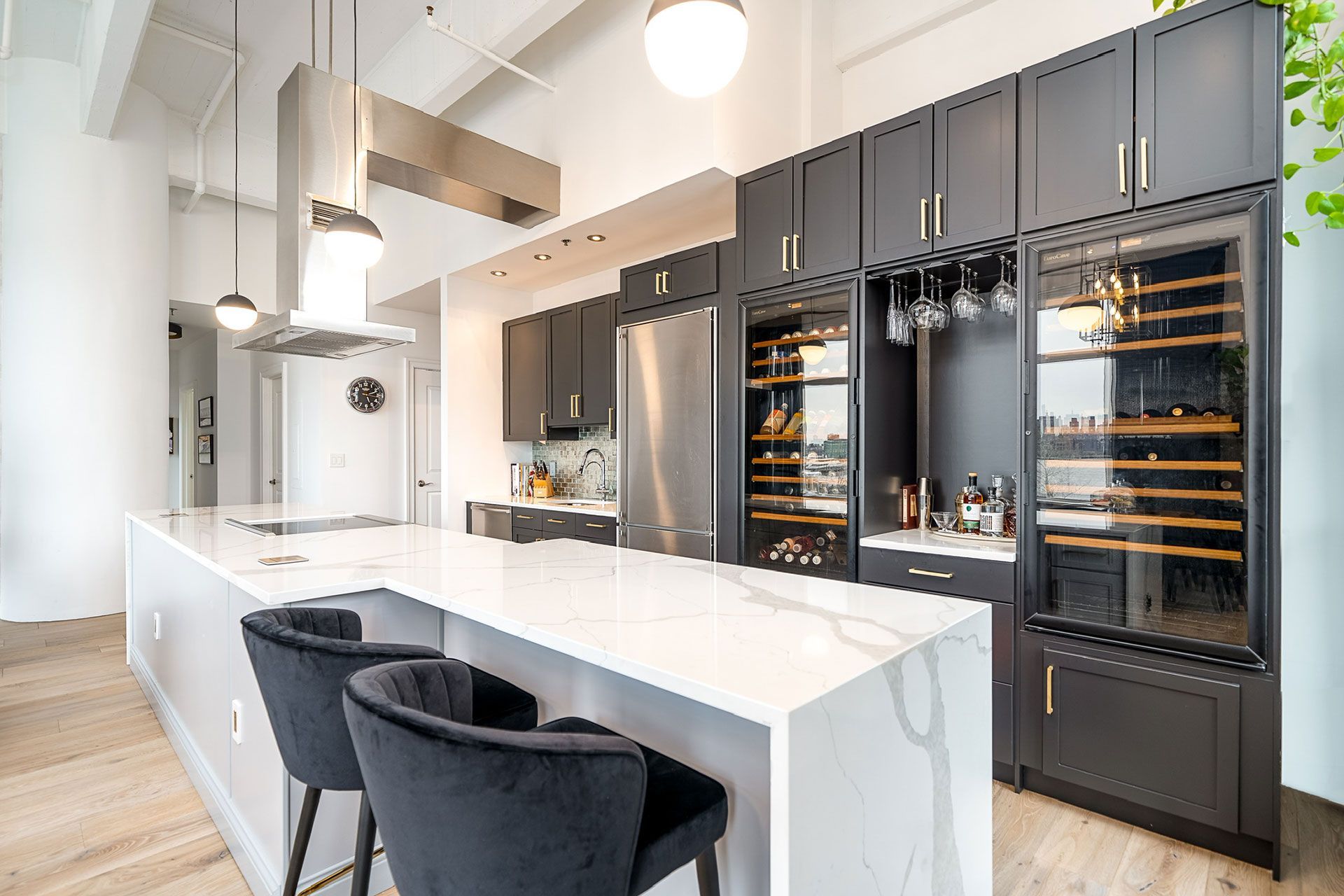 The kitchen served as the primary focus of the project, anchored by a complete redesign of the existing 18-foot island. The original raised counter was removed and replaced with a clean, uninterrupted waterfall-edge quartz surface, creating a more functional and visually cohesive centerpiece.