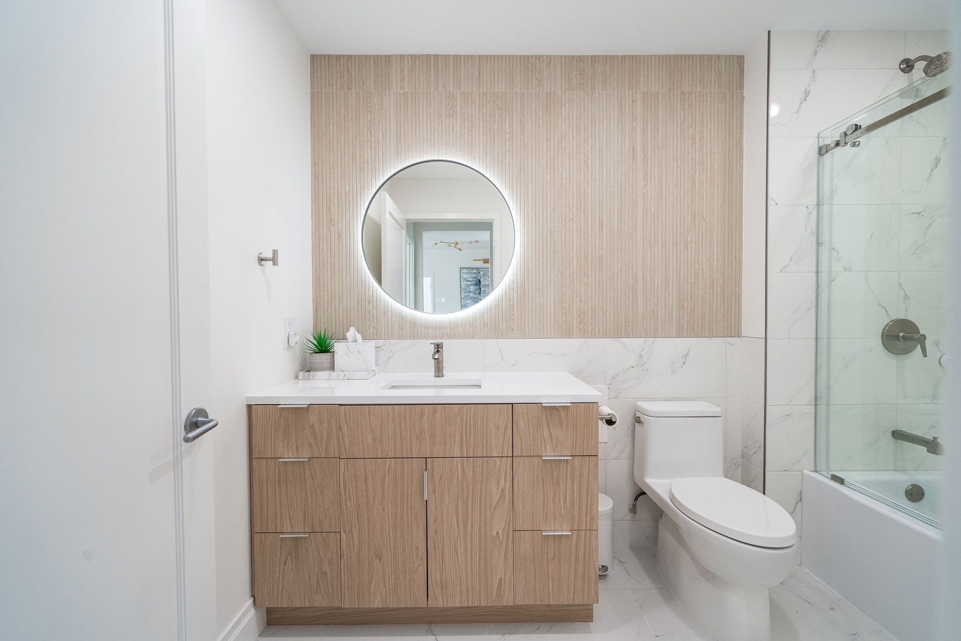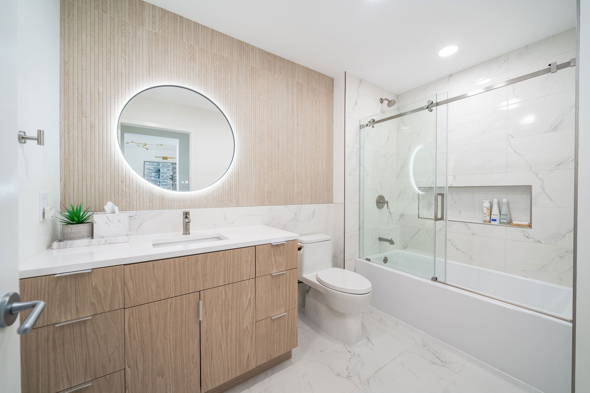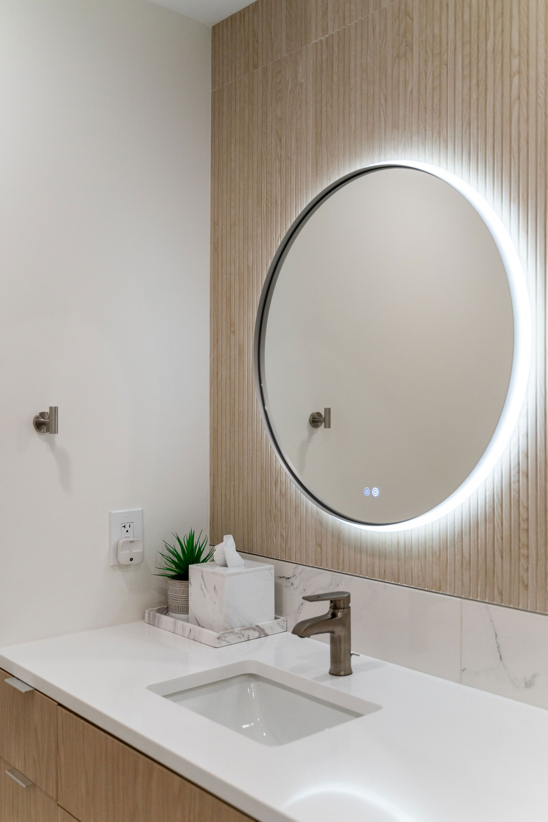 The design is rooted in a soft, tonal palette of warm whites and natural woods, creating an atmosphere that feels both calming and sophisticated. Clean architectural lines are paired with organic textures, allowing each material to stand on its own without unnecessary ornamentation. The result is a space that feels effortless—minimal, yet deeply intentional.