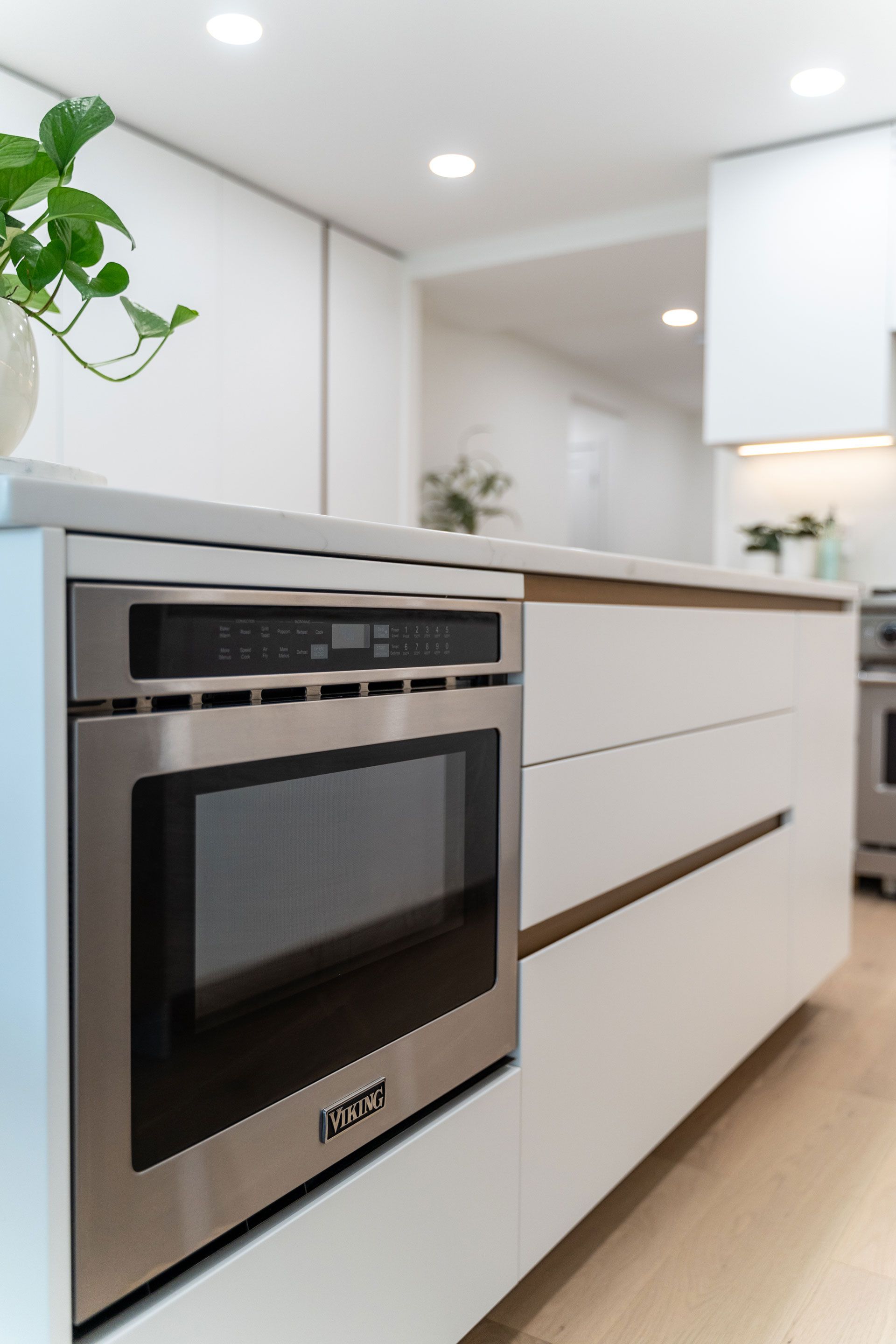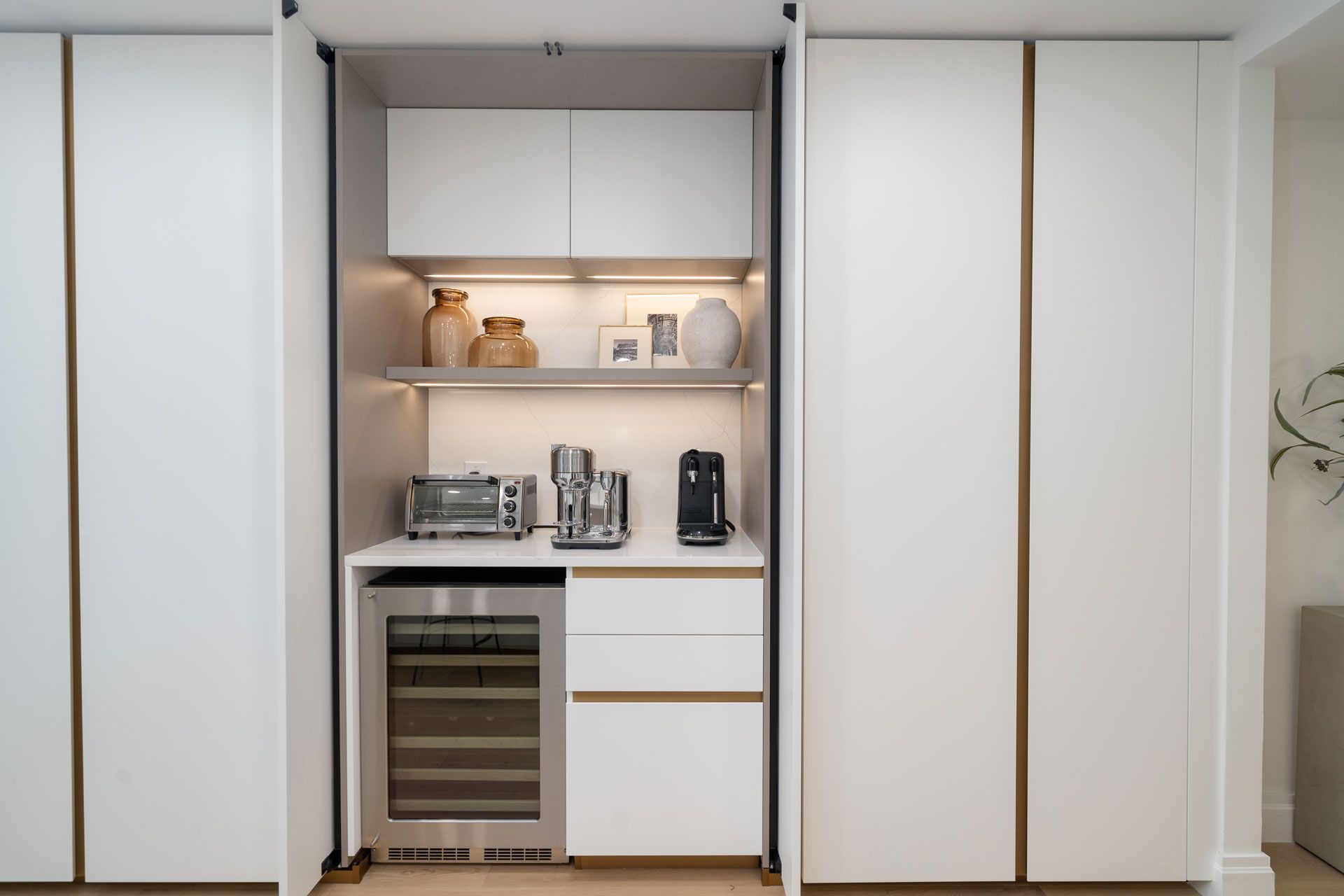 The kitchen is a centerpiece of understated elegance. Wrapped in soft neutral tones and complemented by natural stone surfaces, it balances performance with refined simplicity. Integrated appliances and tailored storage solutions maintain a clean visual language while supporting everyday function and entertaining with ease.
