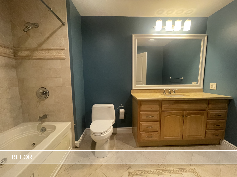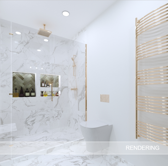 Tile selections were chosen to reinforce a streamlined, modern look. Large-format floor tiles minimize grout lines and enhance the sense of openness, while integrated wall detailing— including a built-in shower niche—adds both function and visual continuity.