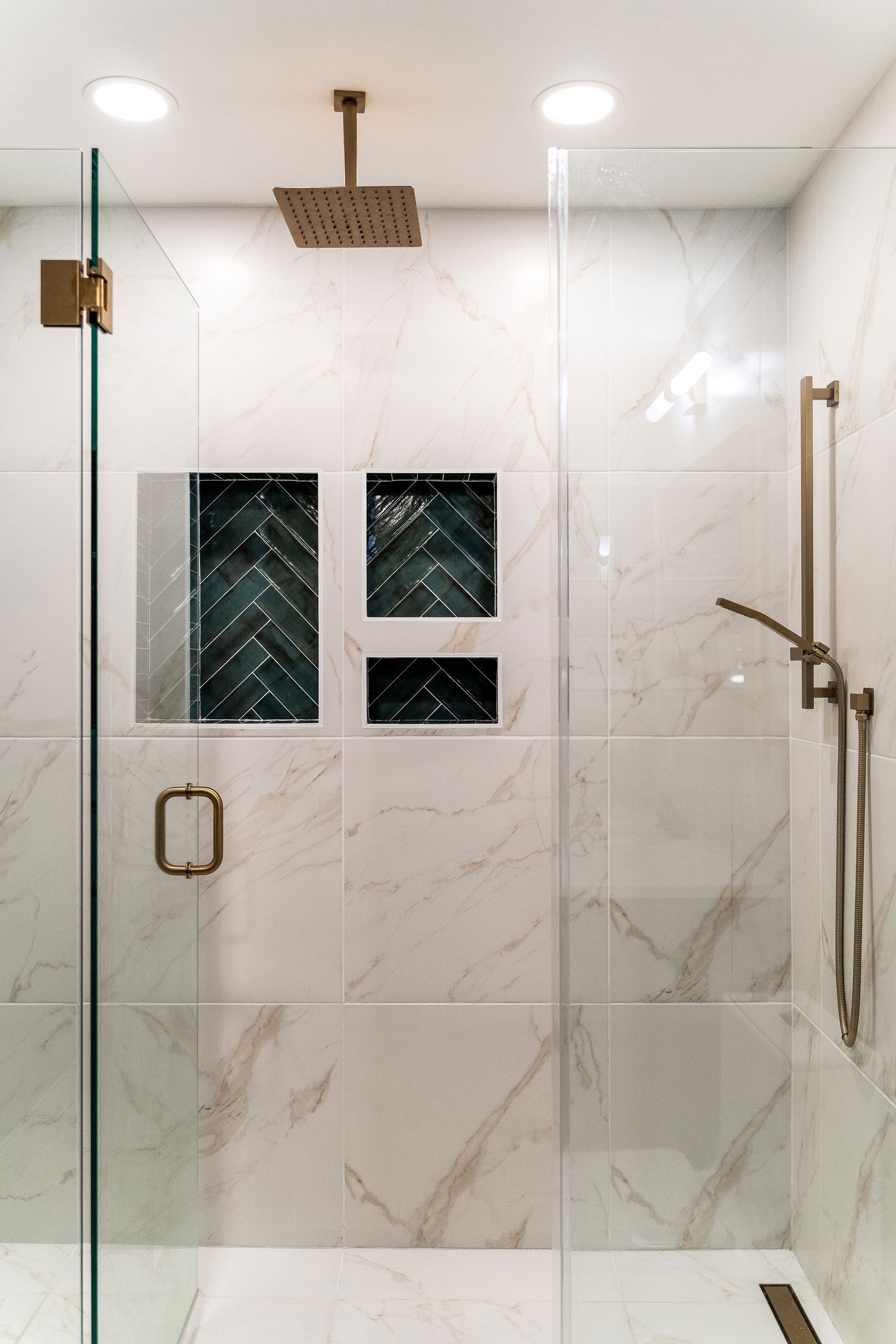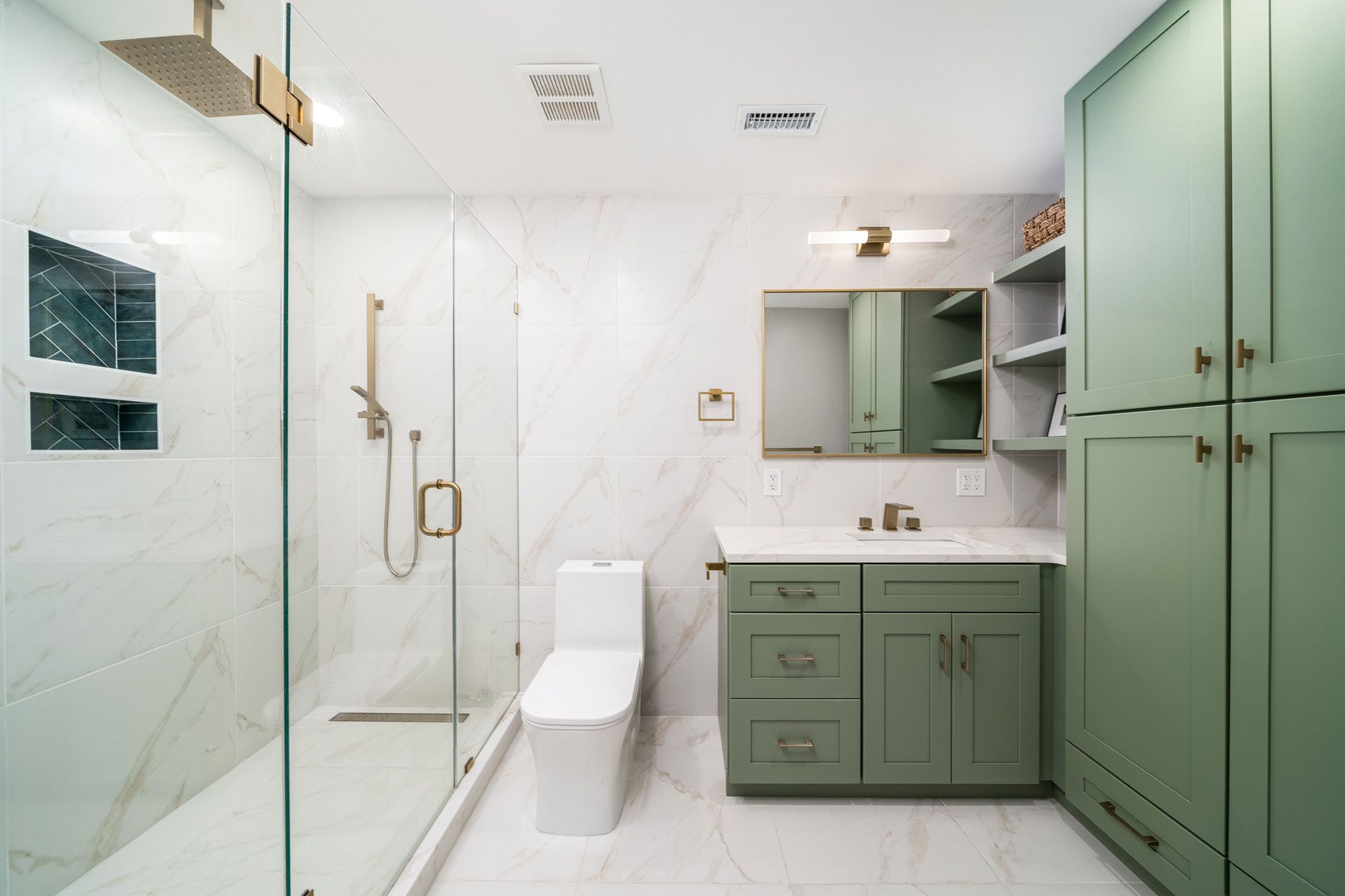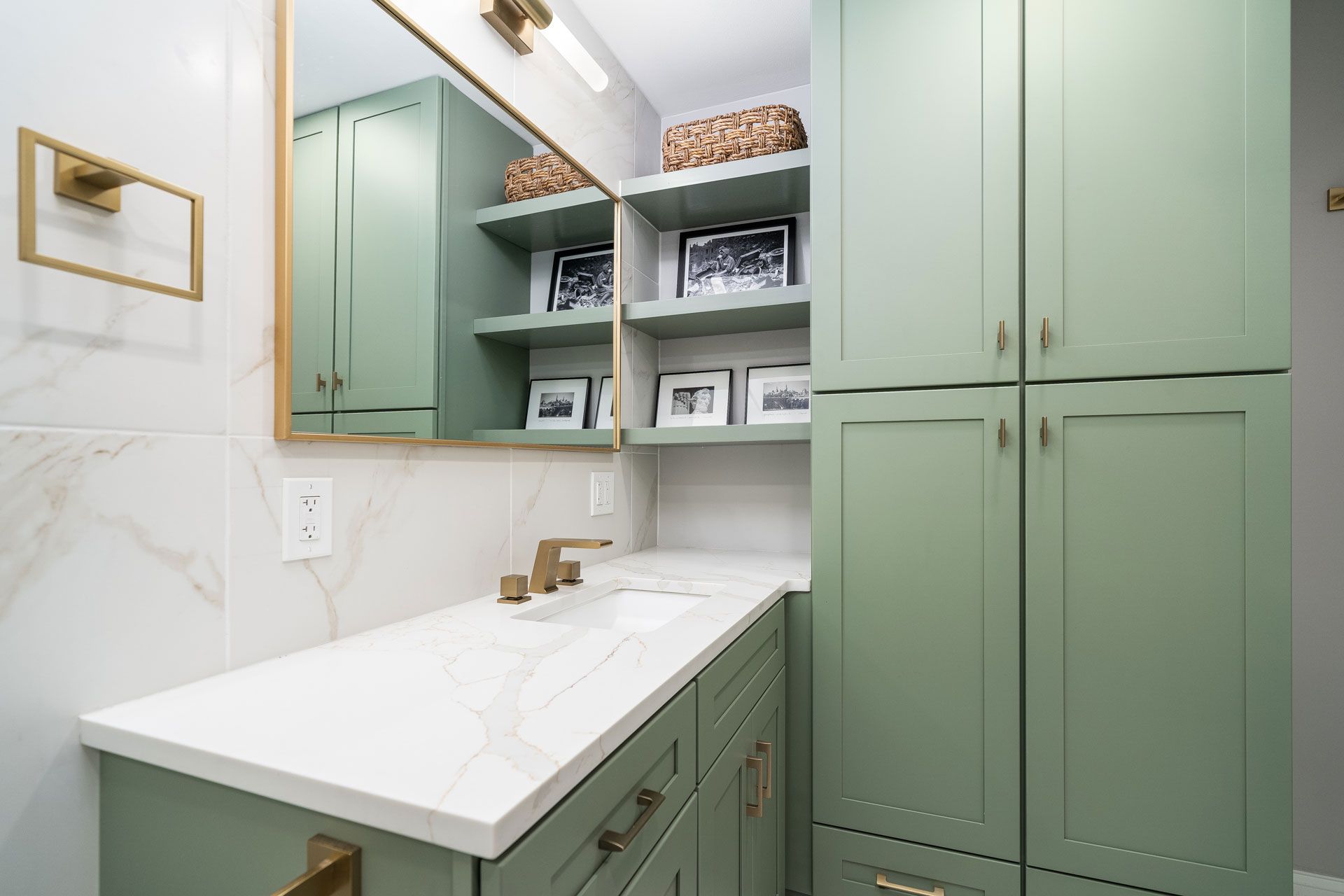 The design is anchored by a custom green vanity, introducing depth and contrast while maintaining a clean, tailored aesthetic. This focal point is paired with warm gold fixtures and hardware, creating a balanced palette that feels both elevated and intentional.